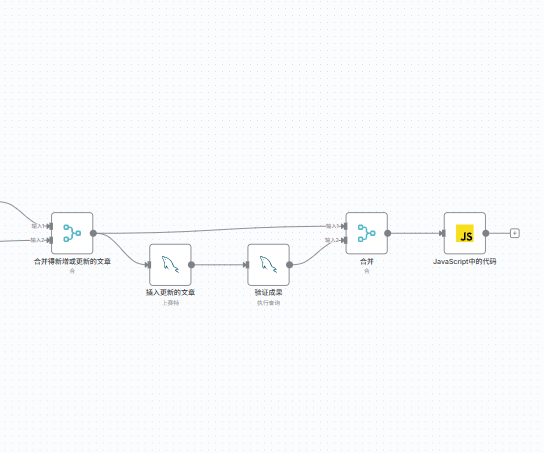当然各位在完成打包子工作流程之后,也不要忘了一件事情,就是N 8n中默认将最后一个节点输出作为他们传递的参数。还记得我们当初的目的是什么吗?对于新增或更新的文章进行提取文件并进行初步格式转换,所以我们后续还要进行这么一个设计。将合并得新增或更新的文章节点与验证成果的节点通过merge节点进行只输出,当然我们选择新增或更新的文章作为输入1,将验证成果作为输入2