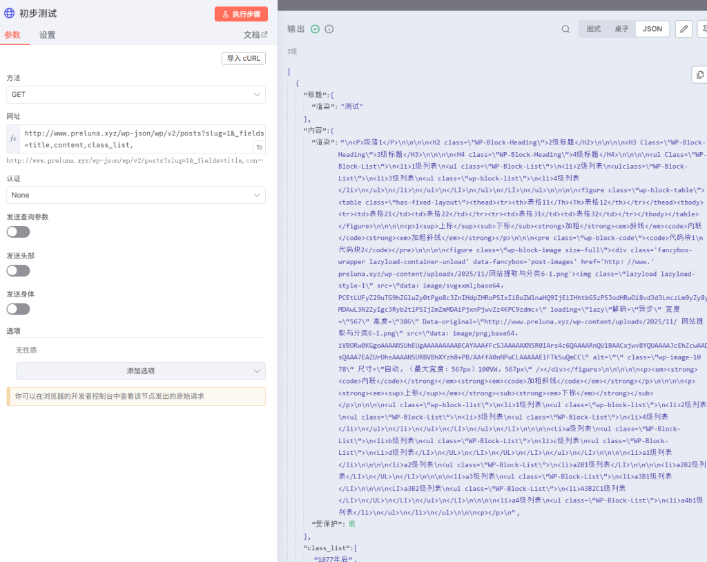 http://www.preluna.xyz/wp-json/wp/v2/posts?slug=1&_fields=title,content,class_list,参数slug定向拉取test文章,参数_fields=title,content,class_list请拉取标题,内容,标签。
