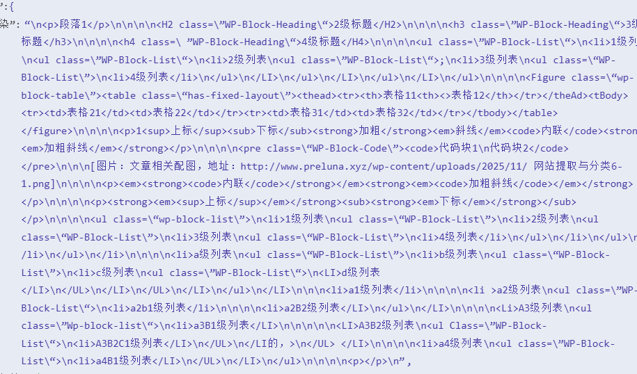 我们成功的将复杂的WordPress HTML内容转换为了AI友好的结构化文本格式。通过标准化的标记系统和清晰的内容分层,AI能够准确识别文档的各个组成部分,理解内容之间的逻辑关系,并为后续的智能分析、内容重组、自动化处理等任务提供了理想的数据基础。最终的输出数据不仅保留了原始内容的完整信息,更重要的是以机器可理解的方式重新组织了这些信息,这正是我们整个处理流程设计的核心价值所在。