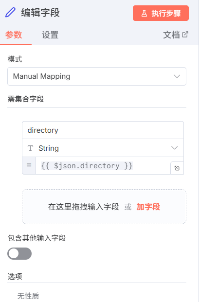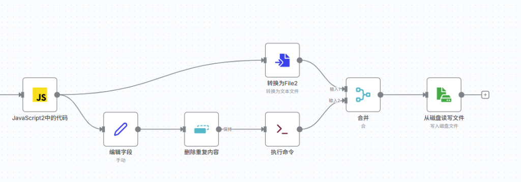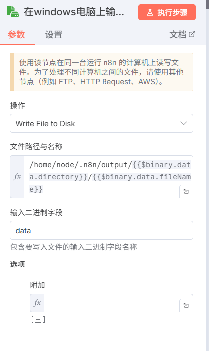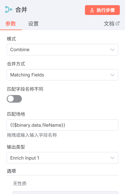 由于n8n抽象的对于分支任务的处理方式,如果你不能保证在向磁盘输入文件放在工作流程中最后一个处罚的时候,他就会有可能因为你的文件夹还没有创建好而就返回会找到该文件的问题,并且还有一点在n8n的最新版本中它部分去除了如果没有找到该文件夹,则就创建该文件夹的选项,真是越更新越回去了,所以我们为了解决上述的问题,我们就要想着让他在在创建文件夹完成之后再执行,我们可以利用n8n的另外一个机制,就是对于merge节点会等到所有输入端都有输入或者某一输入端传来报错的时候才开始执行,所以我们在merge节点里面选择在模式选将匹配的物品合并在一起,合并方式是将字段值相同的物品进行合并,选择{{$binary.data.fileName}},匹配场地输出类型选择所有输入1,将复合结果的输入二数据加入。
