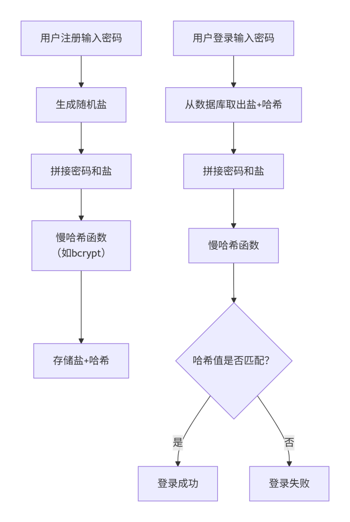 这张图展示了密码存储的两个关键阶段:注册(上半部分)和登录(下半部分)。注册时,系统生成随机盐,与用户密码拼接后送入慢哈希函数,将结果(包含盐和哈希)存储;登录时,系统取出存储的盐和哈希,将用户输入密码与盐拼接,再次执行相同的慢哈希,然后比对结果。箭头表示数据流动,其中盐和哈希始终结合,确保相同密码产生不同结果,且验证过程不暴露原密码。