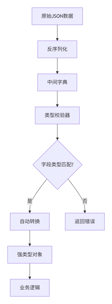 这张图描绘了从反序列化后的原始字典到强类型对象的转换过程。类型校验器检查每个字段是否与预定义类型匹配,如果匹配,则可能进行自动类型转换(如字符串到日期),最终生成一个强类型对象供业务逻辑使用;如果不匹配,则直接返回错误,防止非法数据进入后续流程。