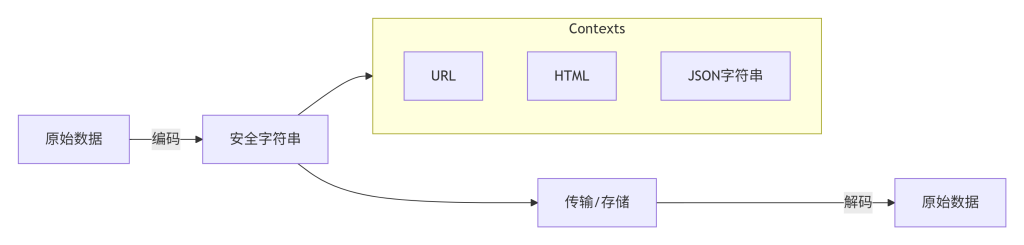 这张图展示了编码和解码的基本流程。原始数据经过编码成为安全字符串,然后进入特定的上下文(URL、HTML、JSON字符串等)传输或存储;接收方从上下文中提取安全字符串,再解码还原为原始数据。箭头方向表示数据流向,强调了编码是为了适应特定上下文而进行的必要转换。