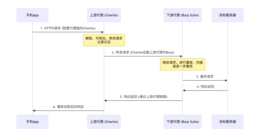 这张图展示了一个典型的 Charles + Burp 联动场景。最左侧的“手机App”将代理指向了 Charles(上游)。Charles 在完成自己的解密、可视化工作后,并没有直接将请求发往公网,而是将其转发给了配置好的下游代理 Burp Suite(步骤 2)。Burp 作为下游代理,可以对这个请求进行更深入的操作,比如利用 Intruder 进行参数枚举,或者交给 Active Scanner 进行漏洞检测。之后,Burp 将请求发送给“目标服务器”(步骤 3)。返回的响应沿着步骤 4、5、6 逐层回溯,最终由 Charles 重新加密回复给 App。图中每个箭头都代表一次完整的 HTTP/S 请求-响应交互,但响应路径严格遵循请求路径的反向顺序。颜色上,我们沿用上一张图的风格,突出工具间的接力。