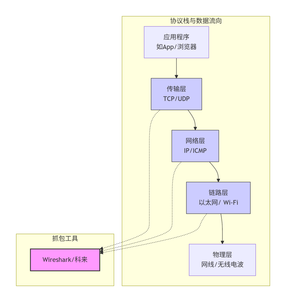 Mermaid 图表:Wireshark在协议栈中的捕获位置示意图