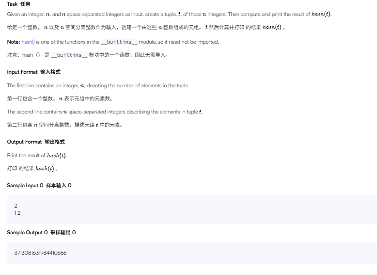 先读入一个整数 n,再读入一行整数,把这些整数做成一个元组 t,最后输出 hash(t)。