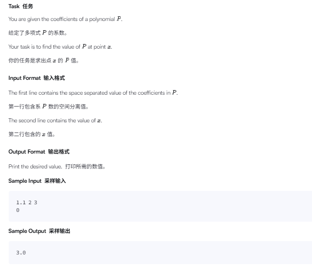 题目输入第一行是一串多项式系数,第二行是 x